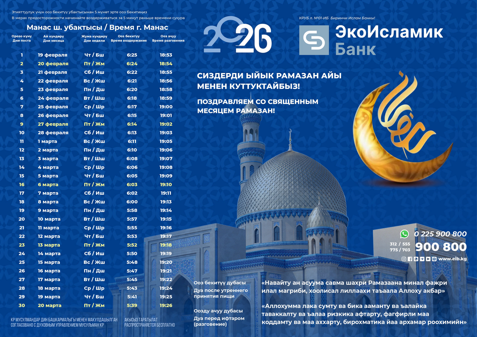 Для всех кыргызстанцев, которые планируют держать пост в Священный месяц Рамазан, ЭкоИсламикБанк подготовил календари с указанием точного времени в различных городах.