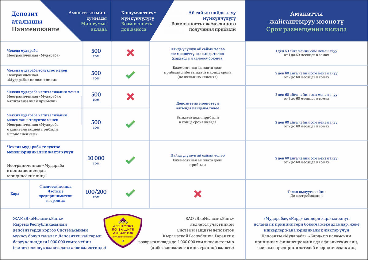 ЗАО «ЭкоИсламикБанк» является участником Системы защиты депозитов Кыргызской Республики. Гарантия возврата вклада c 10 июня 2023 года составляет 1 000 000 сомов включительно (либо эквивалент в иностранной валюте)